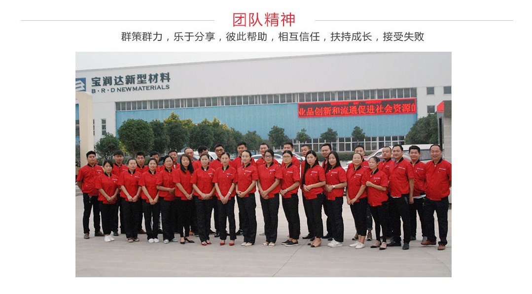 寶潤達新型材料有限公司以追求“品質至上,誠信待人”為使命,堅持綠色環(huán)保生產(chǎn), 堅持以人為本,用心打造讓客戶滿意的產(chǎn)品與服務,給員工提供更加安全、舒適的工作環(huán)境 ,正向著更高、更強的目標邁進。