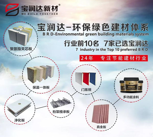 寶潤達(dá)自成立以來,以綠色、環(huán)保、節(jié)能為核心,專注于綠色節(jié)能環(huán)保建材產(chǎn)品的研發(fā),寶潤達(dá)自主研發(fā)出聚氨酯節(jié)能板材、外墻保溫裝飾一體板、鋼筋桁架樓承板、無菌凈化板、多功能性環(huán)保涂料等全球最新主流綠色環(huán)保節(jié)能建筑裝飾用品、系統(tǒng)集成品,助推環(huán)保節(jié)能事業(yè)的建設(shè)發(fā)展。